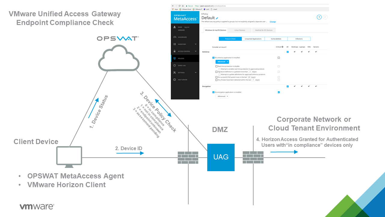 With endpoint compliance checks, ensure all client devices accessing VMware Horizon virtual desktops and applications comply with device policies.