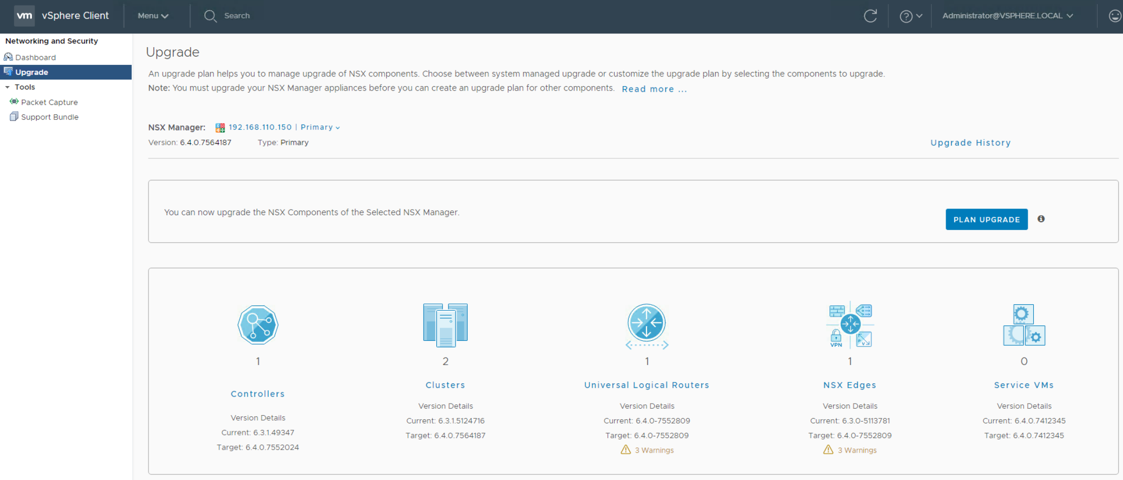 A new feature in NSX for vSphere v6.4 is the upgrade coordinator. In previous versions of NSX you would have to navigate to various distinct areas of the UI to facility an upgrade of your entire NSX environment. This new feature provides a single portal for planning and upgrading the entire NSX system.