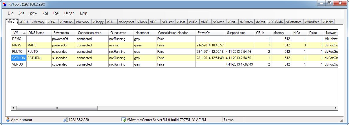 RVTools is a windows .NET 4.6.1 application which uses the VI SDK to display information about your virtual environments. Interacting with VirtualCenter ESX Server 6.5. RVTools is able to list information about VMs, CPU, Memory, Disks, Partitions, Network, Floppy drives, CD drives, Snapshots, VMware tools, Resource pools, Clusters, ESX hosts, HBAs, Nics, Switches, Ports, Distributed Switches, Distributed Ports, Service consoles, VM Kernels, Datastores, multipath info, license info and health…Read More