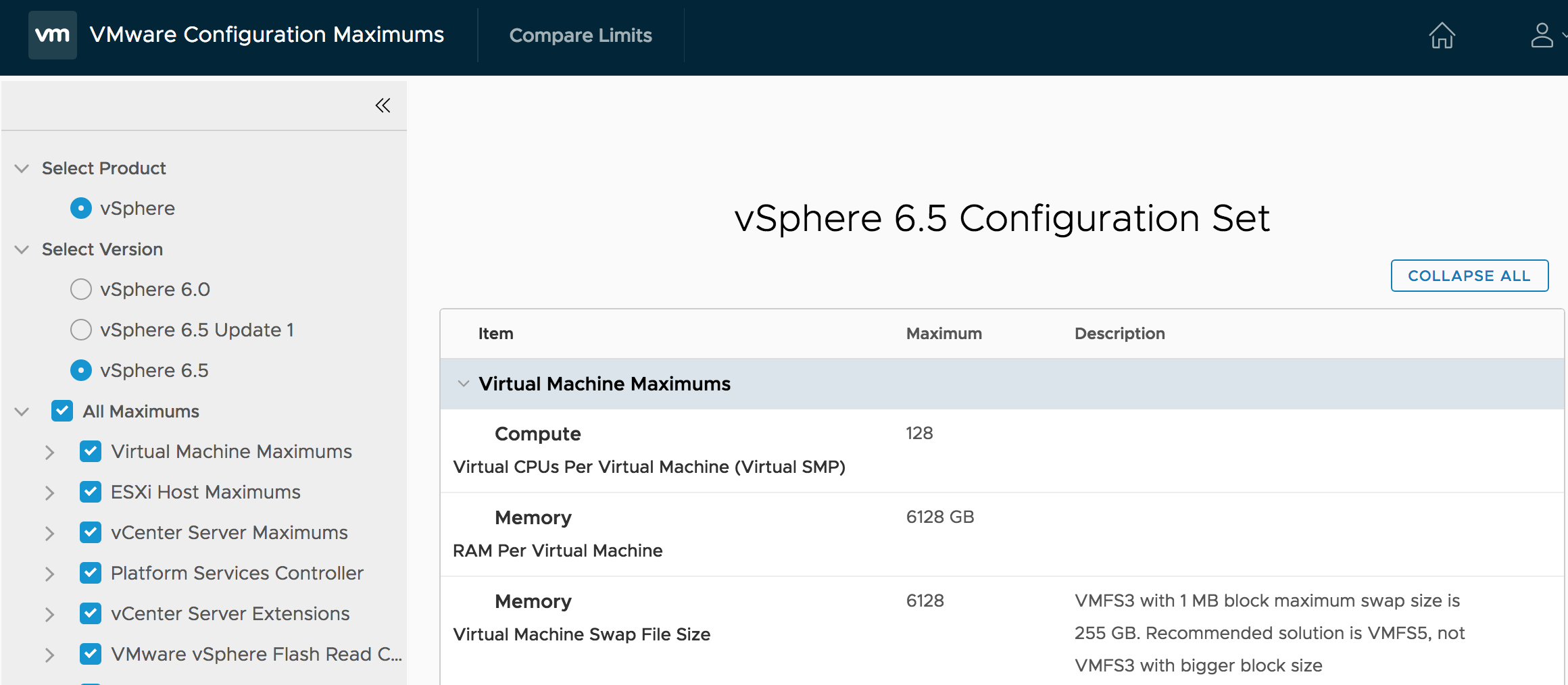 This Configuration Maximums tool provides the recommended configuration limits for VMware products. When you configure, deploy and operate your virtual and physical equipment, it is highly recommended you stay at or below the maximums supported by your product. The limits presented in the tool are tested, recommended limits, and are fully supported by VMware.