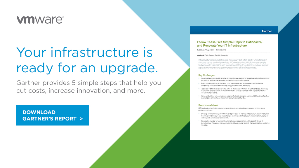 Common management tools and processes for managing infrastructure can help make your journey to infrastructure modernization smoother. Get Gartner’s recent white paper Follow These Five Simple Steps to Rationalize and Renovate Your IT Infrastructure.