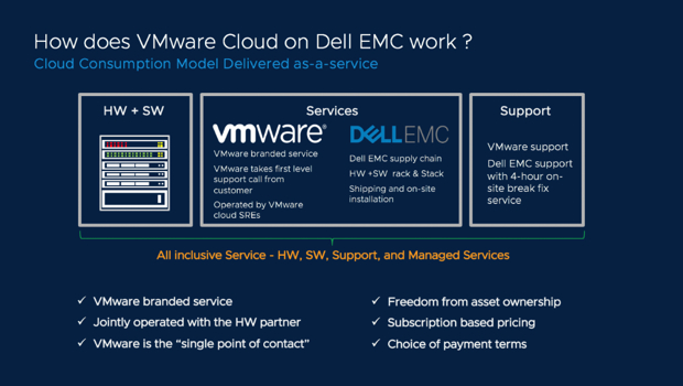VMware Cloud on Dell EMC is a simple, secure and scalable infrastructure delivered as-a-service to users‘ on-premises data centre and edge locations. The service features VMware’s high-performance compute, storage and networking software powered by VMware vSphere, vSAN and NSX running on Dell EMC Vx