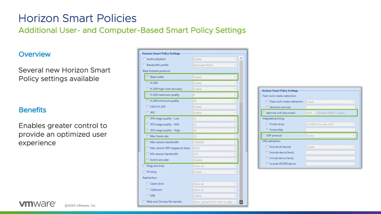 Dynamic Environment Manager 9.11 now adds several new user-based and computer-based Horizon Smart Policy settings. You can also now set a refresh interval for computer-based policies, or set the policies to continuously refresh. The new Find Items option in the management console helps you quickly find the configuration template or condition set you are looking for. VMware End-User Computing (EUC) solutions empower the digital workspace by simplifying app & access management, unifying endpoint management & transforming Windows delivery. Follow the VMware EUC Blog to learn more: https://blogs.vmware.com/euc.