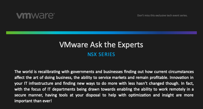 We have set up a series of webinars – ‘VMware NSX Ask the Experts. First in line: April 16th. Register here