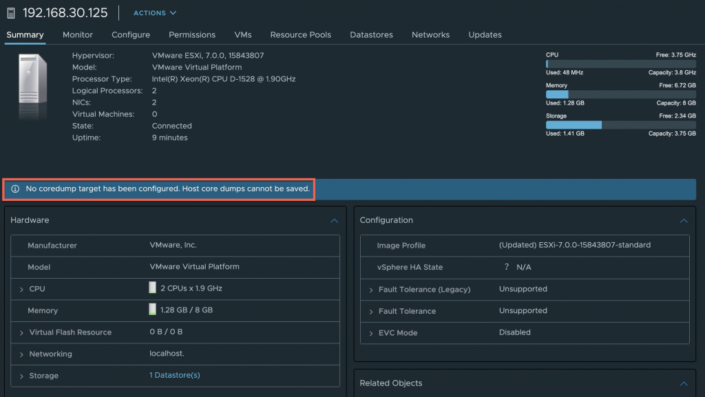 Quick Tip – Suppress new core dump warning in ESXi 7.0