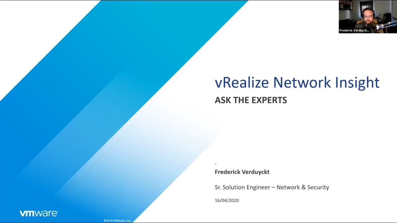 Join Frederick Verduyckt, Senior Solutions Engineer at VMware VMware vRealize Network Insight helps you build an optimized, highly available and secure network infrastructure across hybrid and multi-cloud environments. It provides network visibility and analytics to accelerate micro-segmentation security, minimize risk during application migration, optimize network performance and confidently manage and scale NSX, SD-WAN VeloCloud, and Kubernetes deployments.