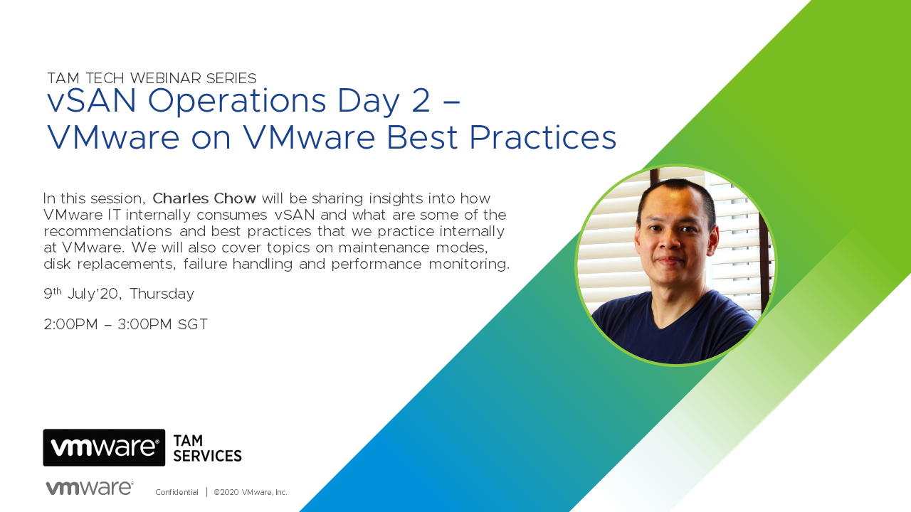 In this upcoming session, Charles Chow will be sharing a little insight into how VMware IT internally consumes vSAN and also what are some of the recommendations and best practices that we practice internally at VMware. We will cover topics around maintenance modes, disk replacements, failure handling and performance monitoring.