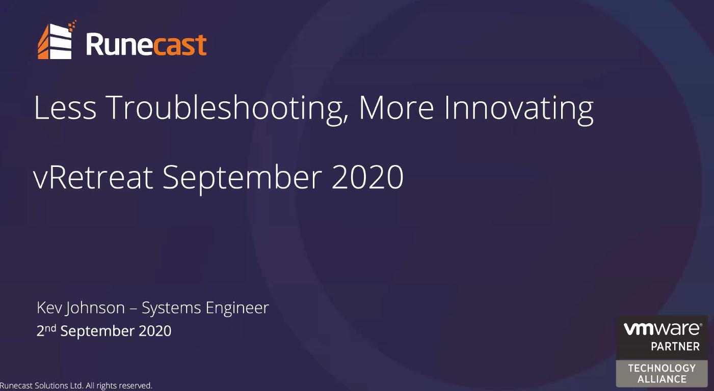 Runecast: Less Troubleshooting, More InnovatingRunecast: Less Troubleshooting, More InnovatingI recently attended an Online vRetreat hosted by Patrick Redknap where we had a presentation from Kev Johnson on the latest updates with Runecast. I have been a huge fan of Runecast since I saw the product at a VMUG a few years ago demo-ed by its... Continue Reading →
