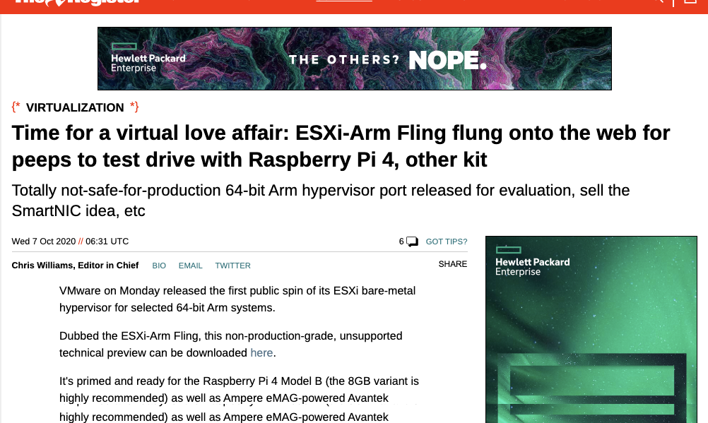 Almost a week into the Fling, there’s already an huge amount of generated content that is very hard to catalogue and organize. It’s been amazing to see the passion and excitement from both VMware, Open Source and Arm communities. There are folks putting their heart and soul into trying things out, e.g. on late nights,