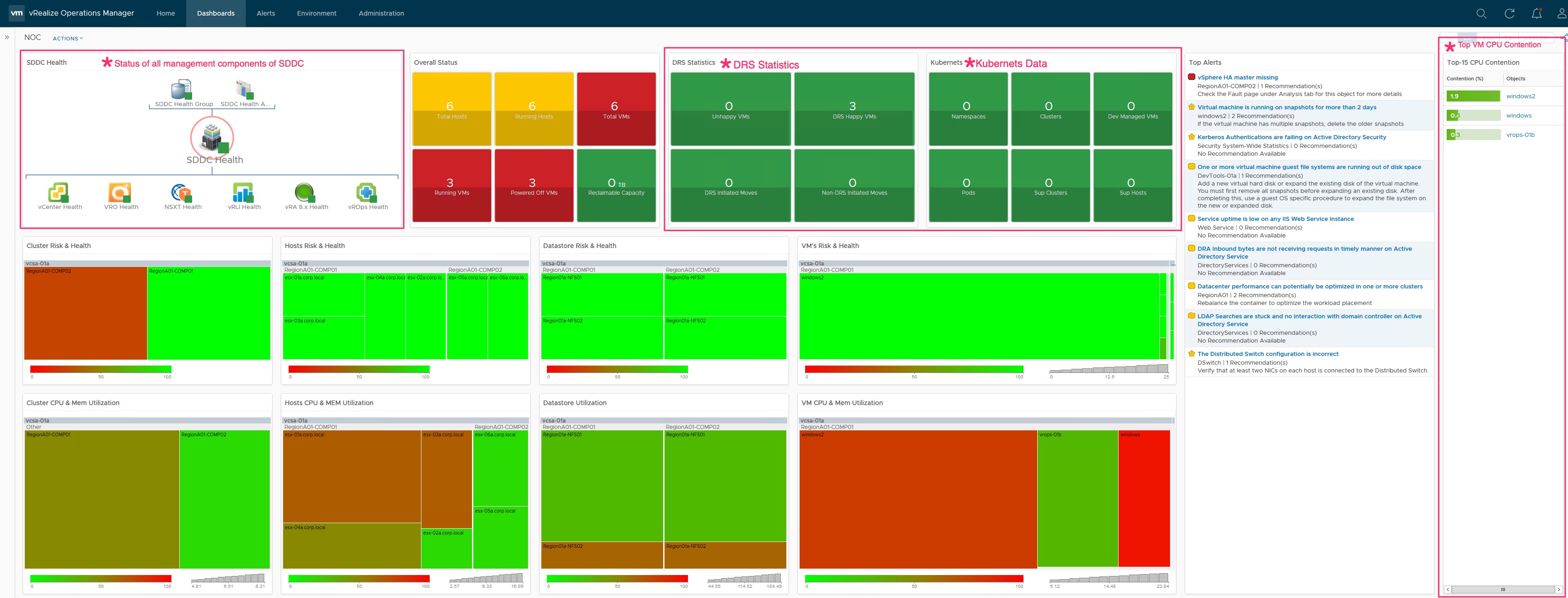 This is the new version of NOC Dashboard compatible with vRops 8.2. In this new version, we have Status of ao management SDDC components, DRS Statistics, Kubernetes Data, and the Top 15 VMs by CPU Contention. Just download here, import and you are good to go.