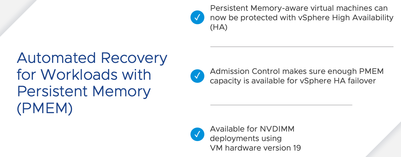 By default, vSphere HA will not attempt to restart a virtual machine using NVDIMM on another host. Allowing HA on host failure to failover the virtual machine, will restart the virtual machine on another host with a new, empty NVDIMM.