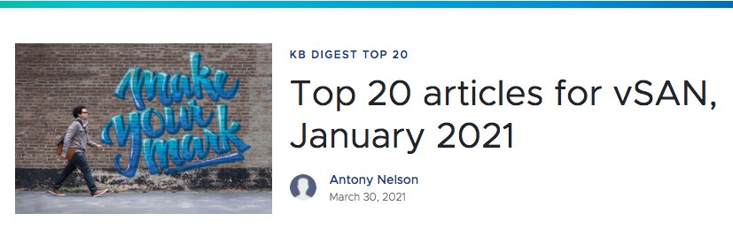 Top 20 articles for vSAN, February 2021Top 20 articles for vSAN, February 2021Check out the Top 20 articles for vSAN, February 2021 - from VMware Support InsiderVMware Social Media Advocacy