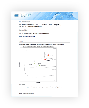 VMware Named a Leader in 2019-2020 IDC MarketScape for Virtual Client Computing. Download an excerpt of the report to see why we believe VMware is uniquely positioned to help you simplify desktop and app management, reduce complexity, lower costs, and enhance security with VMware Horizon.