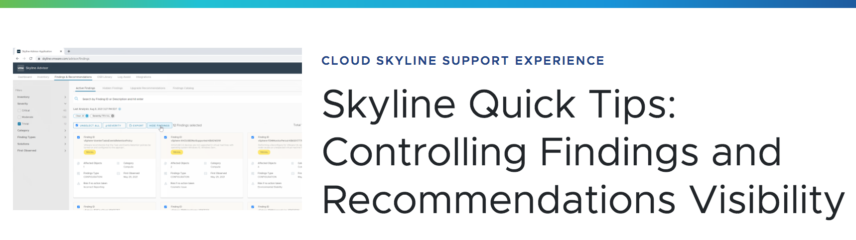 Skyline Quick Tips: Controlling Findings and Recommendations VisibilitySkyline Quick Tips: Controlling Findings and...Did you know that there are multiple ways to control the visibility of findings and recommendations in VMware Skyline? The first use case simply involves hiding the Finding and Recommendation itself. Let’s say, for example, that you want to hide all of VMware... Continue Reading →