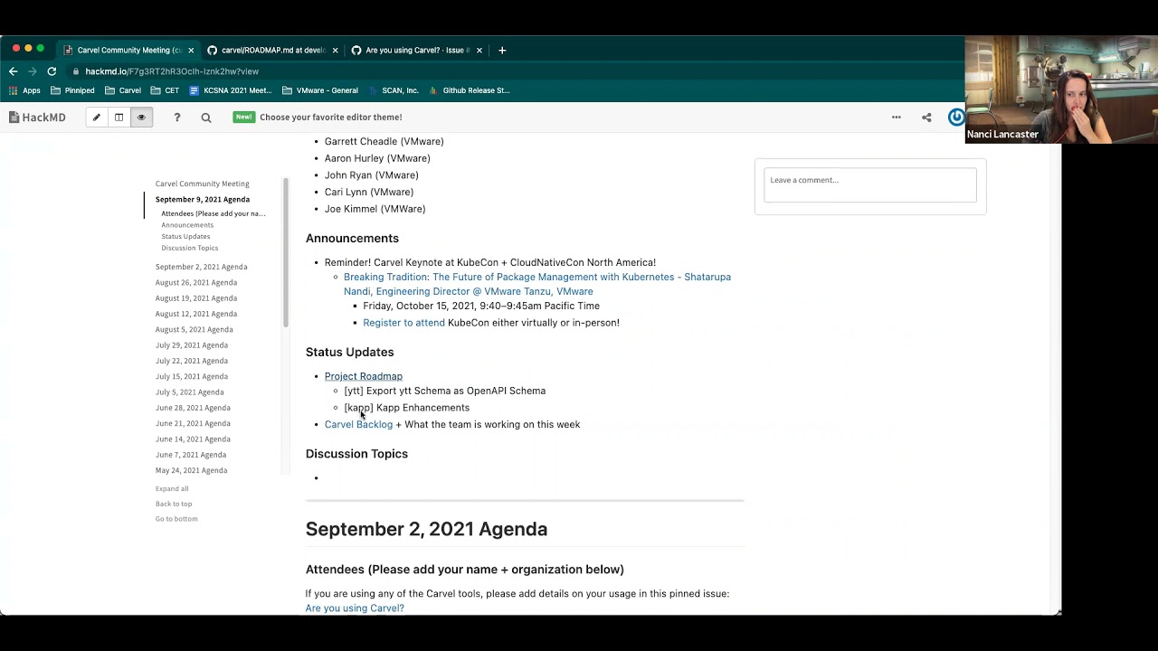 Carvel Community Meeting - September 9, 2021Carvel Community Meeting - September 9, 2021Carvel Community Meeting - September 9, 2021 We meet every Thursday at 10:30am PT. We'd love for you to join us live! Details from this week's [short] meeting can be found here: https://hackmd.io/F7g3RT2hR3OcIh-Iznk2hw#September-9-2021-AgendaVMware Social Media Advocacy
