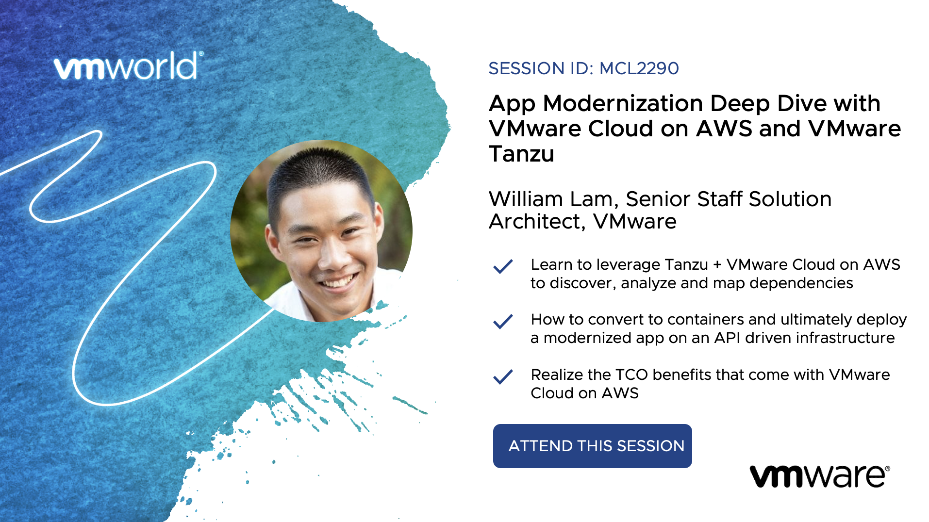 Attend "App Modernization Deep Dive with VMware Cloud on AWS and VMware Tanzu"Attend "App Modernization Deep Dive with VMware...Is app modernization top of mind for your business? You’re not alone, but many are struggling to begin. @lamw’s #VMworld 2021 session covers how to leverage @VMwareTanzu + @VMwareCloudAWS to deploy a modernized application on an API... Continue Reading →
