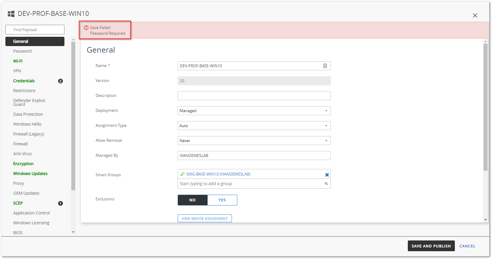 VMware Workspace ONE UEM – Save Failed, Password RequiredVMware Workspace ONE UEM – Save Failed,...This is a small blog post about an unexpected message I received after modifying, saving, and assigning an existing device profile in VMware Workspace ONE UEM.VMware Social Media Advocacy