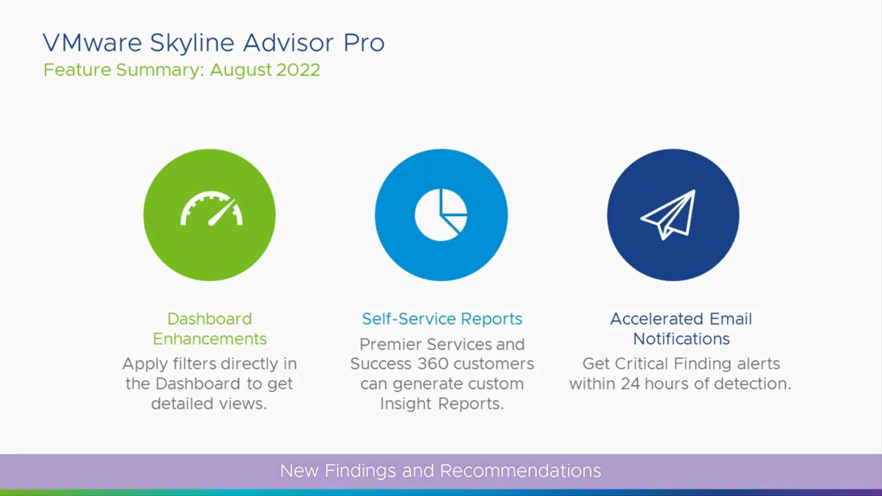 We’re pleased to announce new VMware Skyline Collector 3.2 and Advisor Pro releases with accelerated email notification delivery, dashboard enhancements, self-service reports for Success 360 and Premier Services customers, and new proactive Findings.