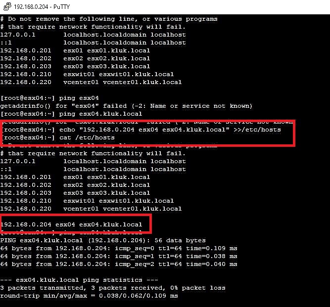 echo "192.168.0.1 esx01 esx01.domain.local" >>/etc/hosts