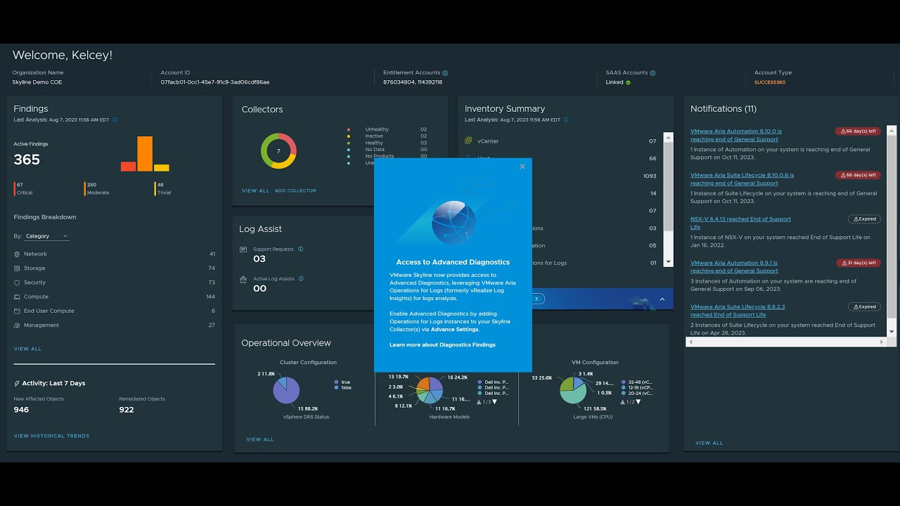 Diagnostic Findings, powered by Aria Operations for Logs, are available in VMware Skyline Advisor Pro. Leverage this feature to prioritize and self-remediate existing issues in your environment. Learn more here: blogs.vmware.com/kb/2023/08/skyline-aug-2023.html