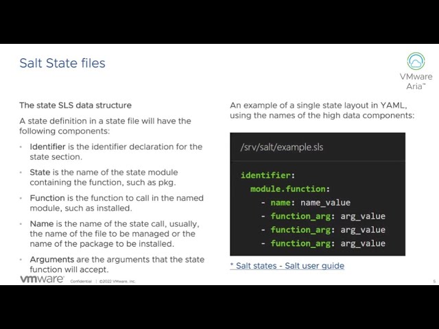 Utilize the VMware Aria Automation Config state management system to create state files that you can apply to several nodes simultaneously rather than manually configuring each node or application one at a time. By incorporating advanced Aria Config state files into your strategy, you can completely automate the deployment process.
