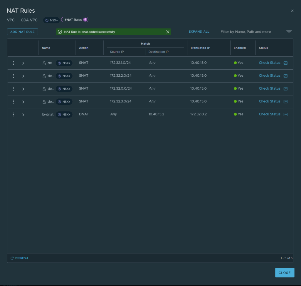 A VPC (Virtual Private Cloud) in NSX+ is an abstraction of many of the constructs that are typically created manually in NSX. These can only be created inside user-created Projects (see Projects for a walkthrough of creating one).