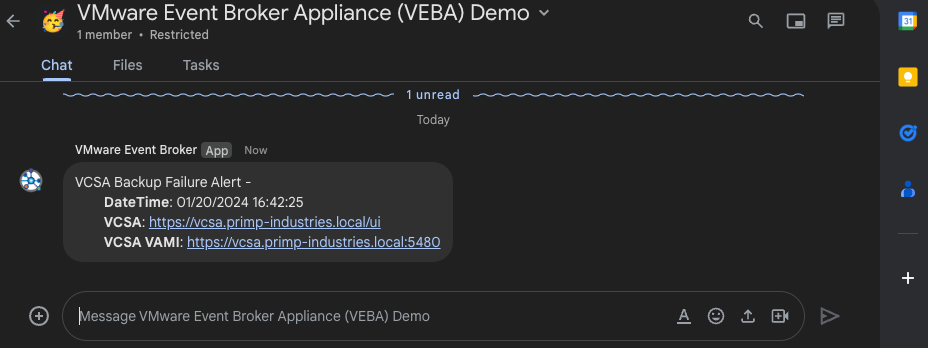 Google Chat space notification for failed vCenter Server Appliance (VCSA) backups using VEBA