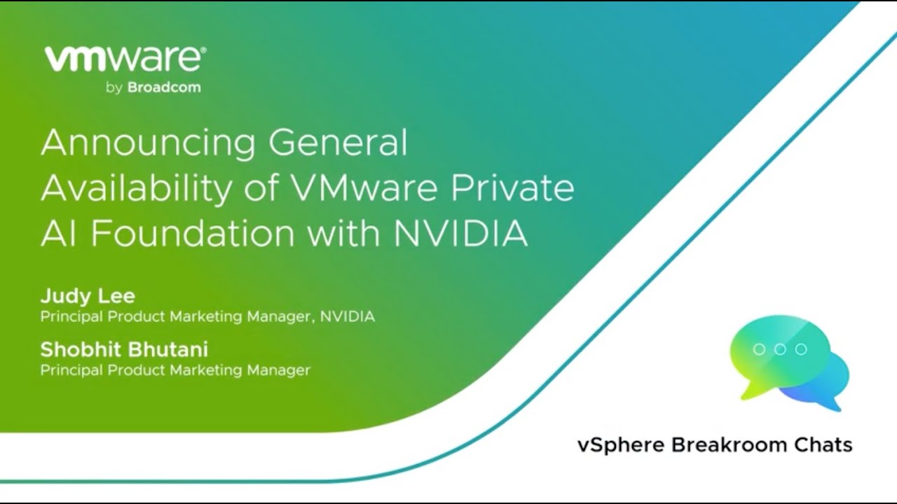 Welcome to this edition of vSphere Breakroom chats, where Judy Lee, NVIDIA, and Shobhit Bhutani, VMware by Broadcom, discuss the General Availability of VMware Private AI Foundation with NVIDIA.