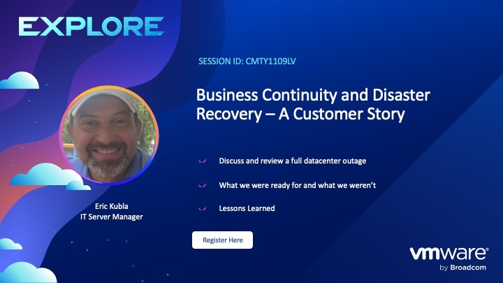 The session will review their BC team/plan before and after the incident and how they improved processes and educated others on expectations vs. reality. Eric has presented this at VeeamOn in 2023, at eight VMUG UserCons in 2023, and at two in 2024.