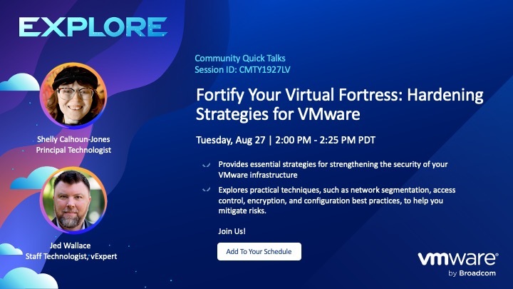 This session provides essential strategies for strengthening the security of your VMware infrastructure. With cyber threats becoming more prevalent, it’s crucial to take proactive measures to protect your virtual environments and sensitive data.