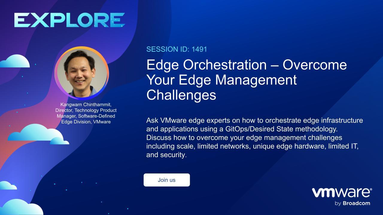 Ask VMware edge experts on how to orchestrate edge infrastructure and applications using a GitOps/Desired State methodology. Discuss how to overcome your edge management challenges including scale, limited networks, unique edge hardware, limited IT, and security.