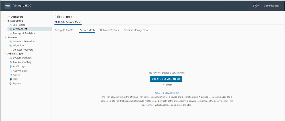 An HCX Service Mesh is the effective HCX service configuration for a paired source and a destination site. You can add a Service Mesh to a Site Pair with a valid Compute Profile created on both sites.Adding a Service Mesh initiates the deployment of HCX Interconnect virtual appliances on both sites.