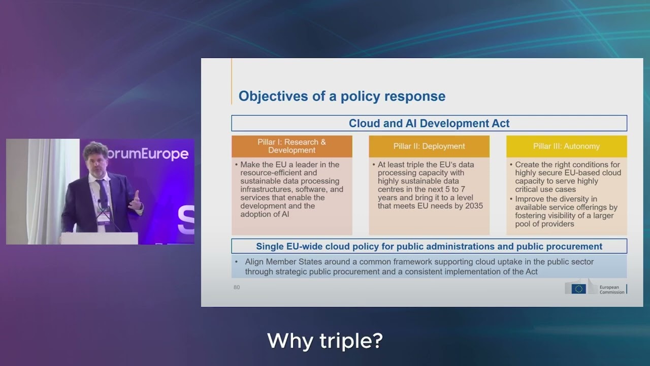 Europe aims to triple its AI deployment capacity within 5-7 years, going beyond the industry’s current doubling efforts. This ambitious goal is crucial for Europe to keep pace with global AI leaders like the U.S. and establish itself as an „AI Continent.“ Manuel Goyet is the European Commission’s Head of Cloud and Software, and this is part of his keynote at European Sovereign Cloud Day in Brussels on 3 June 2025. His full video: https://www.youtube.com/watch?v=ofXGilhc8pE Broadcom media kit for Sovereign Cloud Day: https://news.broadcom.com/sovereign-cloud-day-2025-media-kit