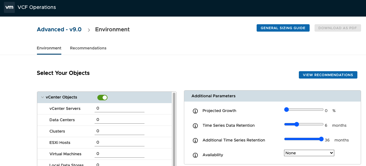 Select the version of VCF Operations(formerly known as vRealize Operations) you are planning to deploy or resize (The sizing guides are version specific)