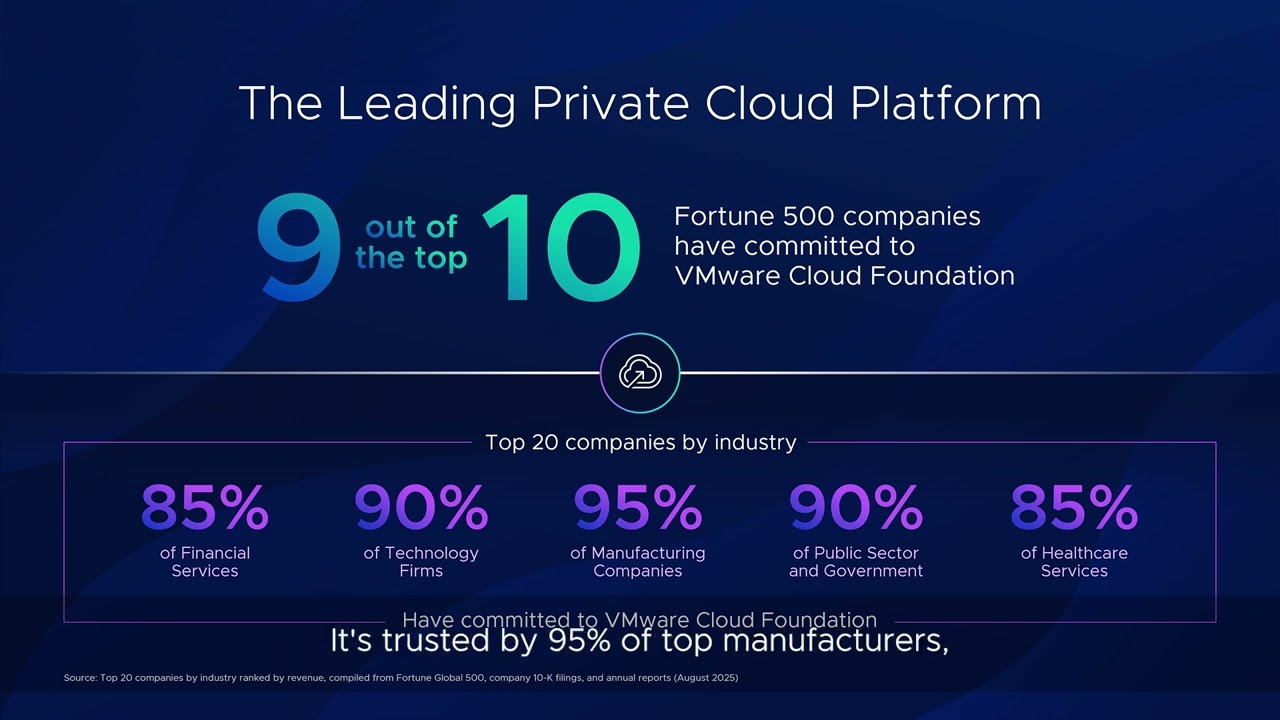 At #VMwareExplore 2025, Paul Turner shared why 9 out of the top 10 Fortune companies and 95% of top manufacturers are committed to VMware Cloud Foundation, and how it provides the controls, security, and trust that businesses require.