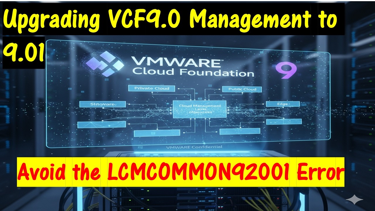 In this video we will update my VMware Cloud Foundation (VCF) ver. 9.0 Management environment to the newly released patch ver. 9.01. I noticed a few things when doing this upgrade that you should be aware of. Also avoid the error LCMCOMMON92001 – I will explain how I ran into this problem.