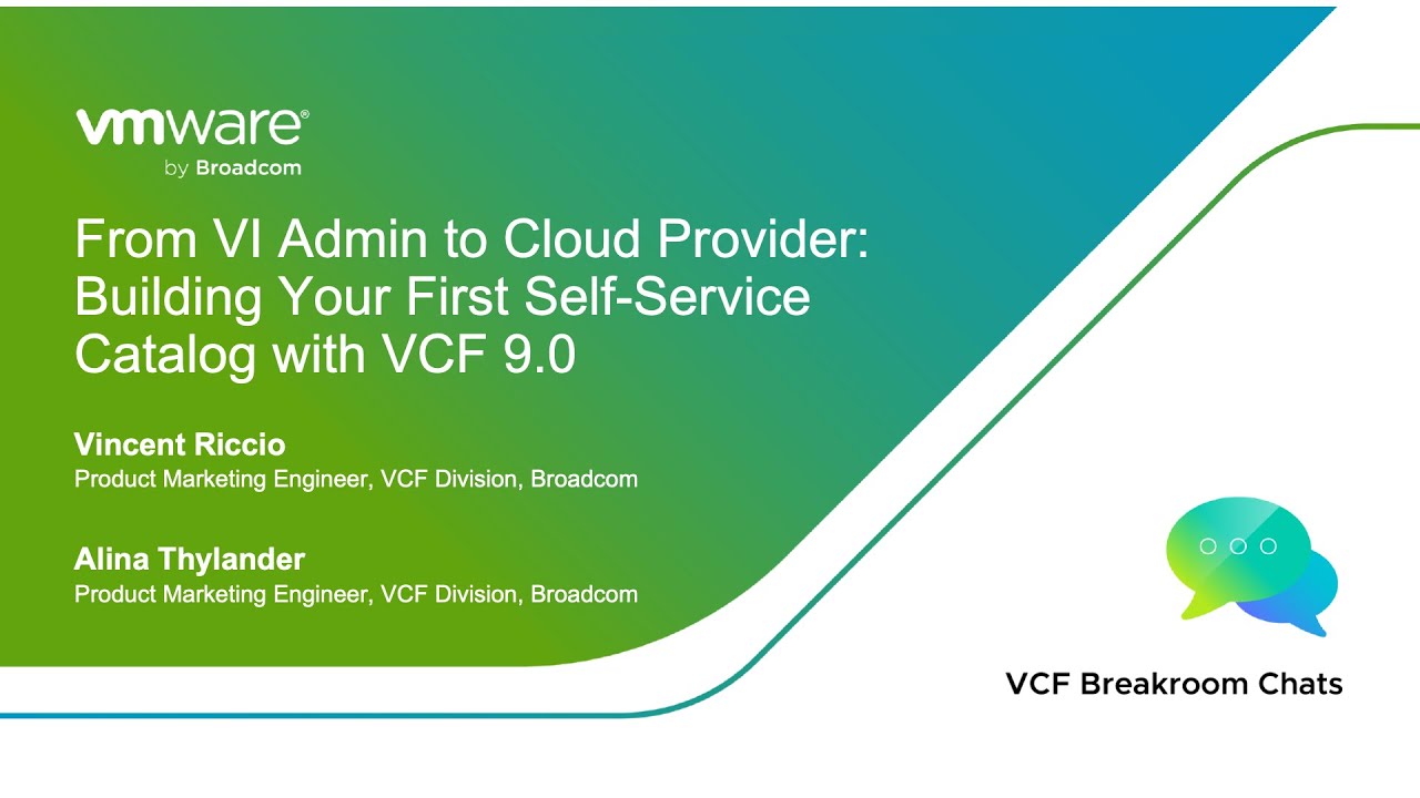 Join us in this episode of VCF Breakroom Chats as Alina Thylander sits down with Vincent Riccio to explore how VMware Cloud Foundation 9.0 helps you build your first self‑service catalog. Learn how VCF Automation transforms developer velocity by replacing ticket queues with on‑demand […]