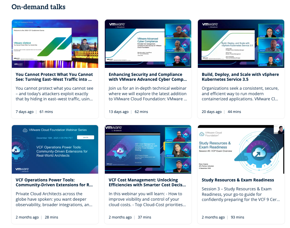 Take a look at the BrightTALK channel for VMware Cloud Foundation (VCF). Our on-demand webinars, talks,