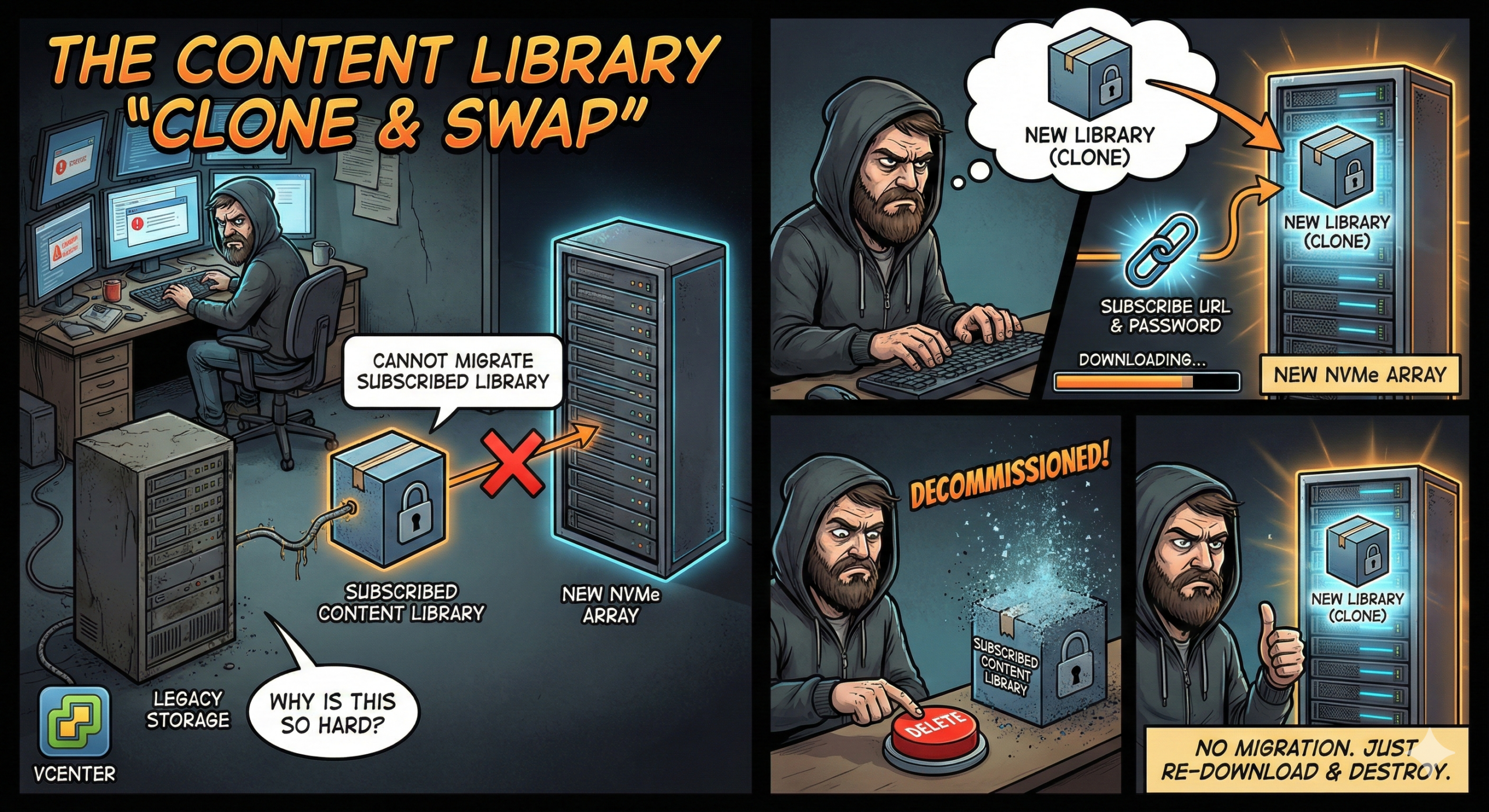 The “Simple” Storage Migration: Why Subscribed Content Libraries are a Pain | We’ve all been there. You’re in the middle of a glorious storage refresh. The storage team has finally racked the new PowerMax arrays, the zoning is done, and you’re happily Storage vMotioning VMs from the old VMAX to the new hotness. Life is good. And then you hit the Content Library. – #vExpert Piotr Tarnawski