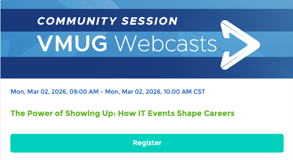 Webcast | The Power of Showing Up: How IT Events Shape Careers. Join Maarten Van Driessen, Leader of the VMUG Belgium Chapter, and Brad Tompkins, VMUG Executive Director, for an inspiring conversation about the transformational impact of showing up to live IT events.
