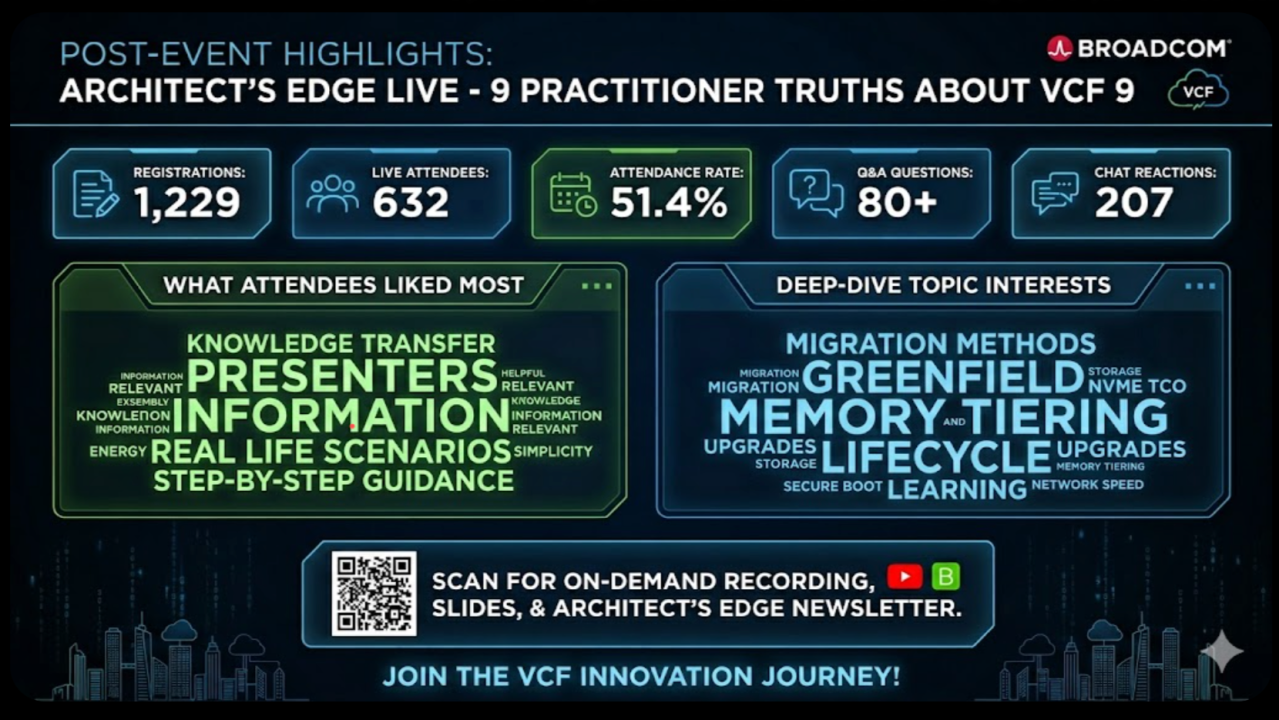 🚀 Wow. What an incredible session! 🚀 Over 600 of you joined us live for Architect’s Edge Live: 9 Practitioner Truths You Didn’t Know About VCF 9, and the energy was absolutely off the charts! With over 80 questions in the Q&A, it’s clear that the practitioner community is hungry for deep, […]