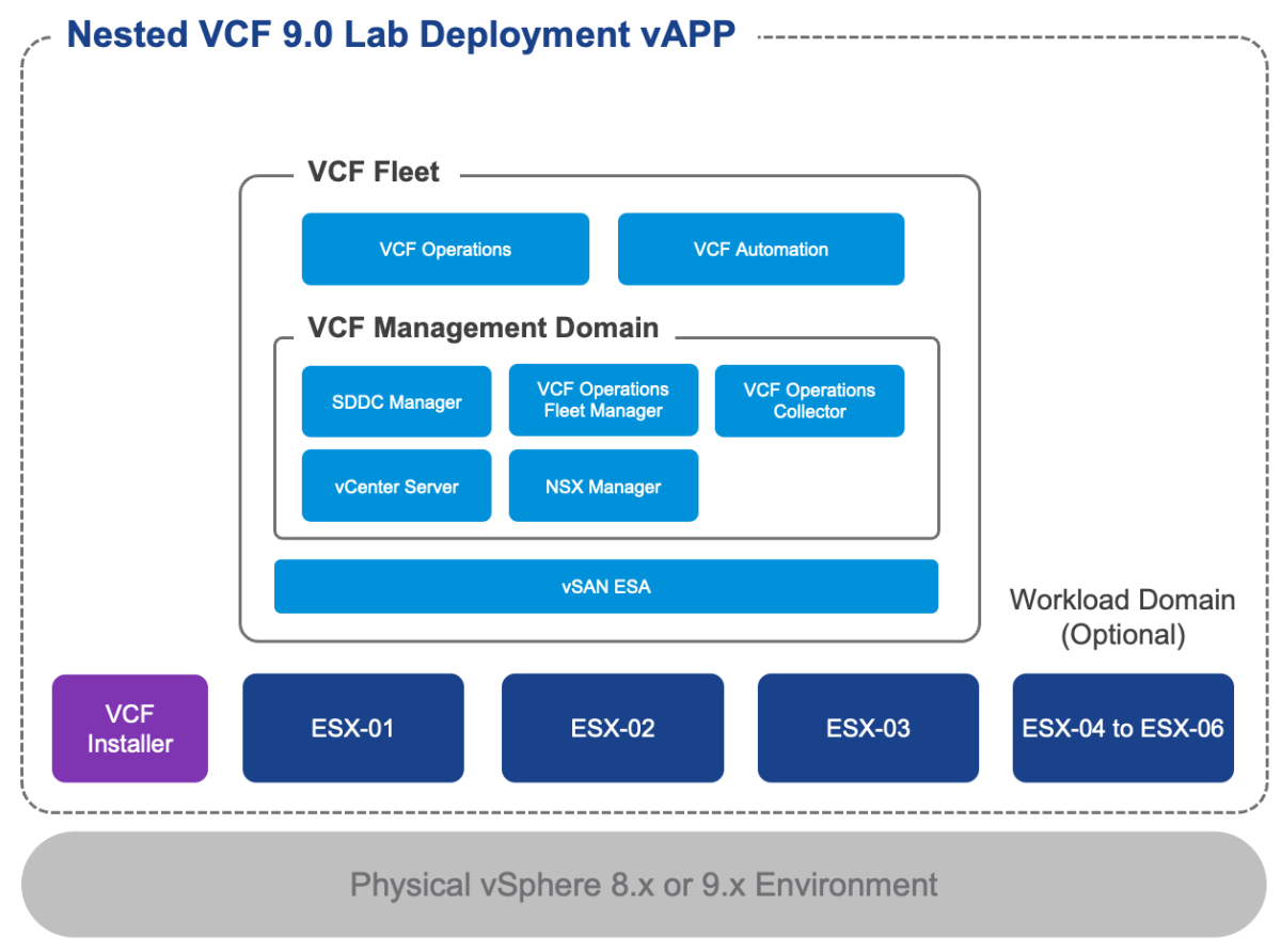 Automated VMware Cloud Foundation (VCF) 9.0 Lab Deployment ScriptAutomated VMware Cloud Foundation (VCF) 9.0 Lab...Now that VMware Explore Las Vegas has concluded, I finally have a small breather to publish my Automated VMware Cloud Foundation (VCF) 9.0 Lab Deployment Script, which utilizes Nested ESXi running on an existing physical vSphere environment, as shown in the... Continue Reading →