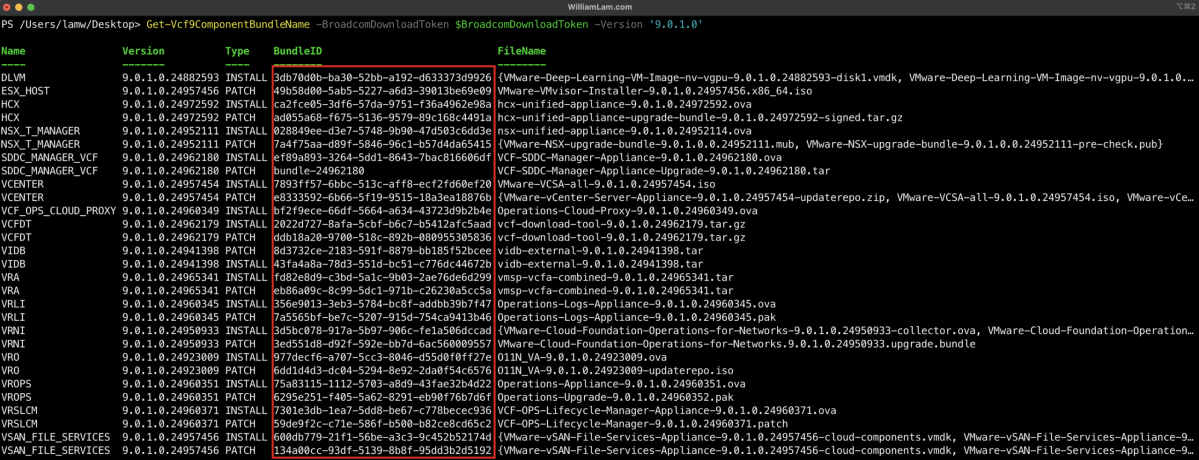 Quick Tip - Correlating VCF Component to Bundle ID/Name – #vExpert William LamQuick Tip - Correlating VCF Component to Bundle...A VMware Cloud Foundation (VCF) release consists of a collection of VCF components that is categorized as either an installation or patch/upgrade file. In VCF 4.x/5.x, a VCF component would contain two different identifiers, a UUID... Continue Reading →